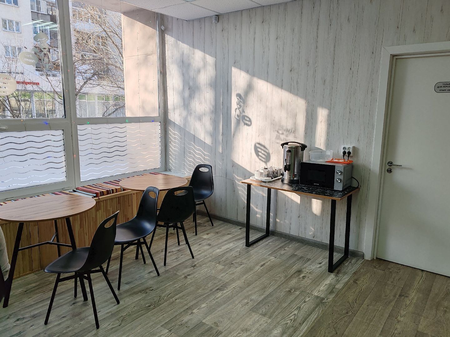В заведении приятный интерьер. Гости могут расположится за уютными круглыми столиками возле окна.